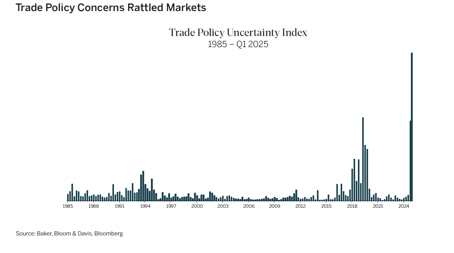 During the first quarter, the Trump Administration imposed the highest U.S. tariffs in almost a century, called them off, put them back and threatened more to come, driving the Trade Policy Uncertainty Index to a record high.